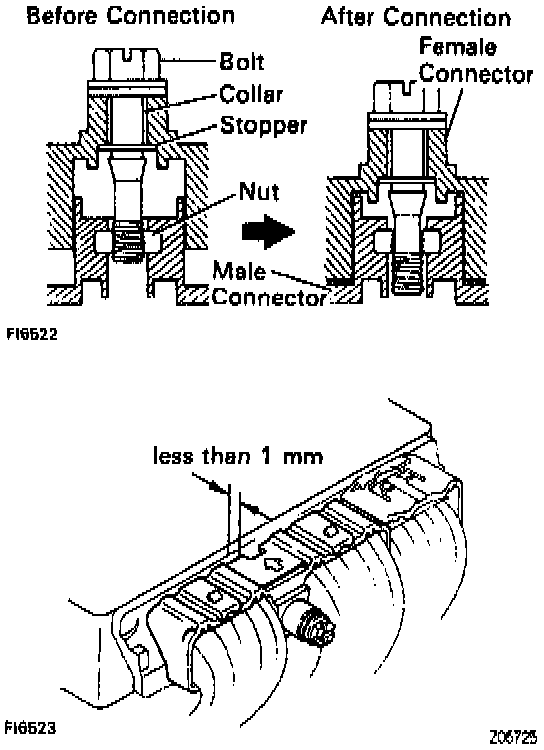 NOTE: Make sure the connector is completely connected, by tightening the bolt until there is a clearance of less than 1 mm (0.04 in.) between bottom of the male connector and end of the female connector.