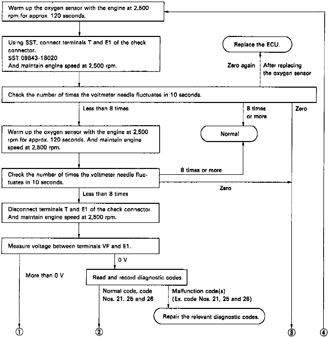 Connect the positive (+) probe of a voltmeter to terminal VF of the data link connector 1, and negative (-) probe to terminal E1. Perform the test as follows:
