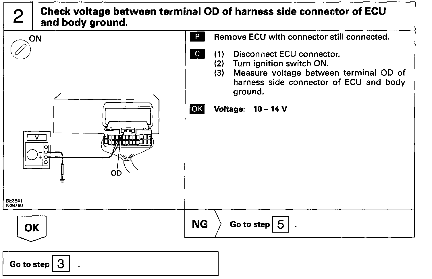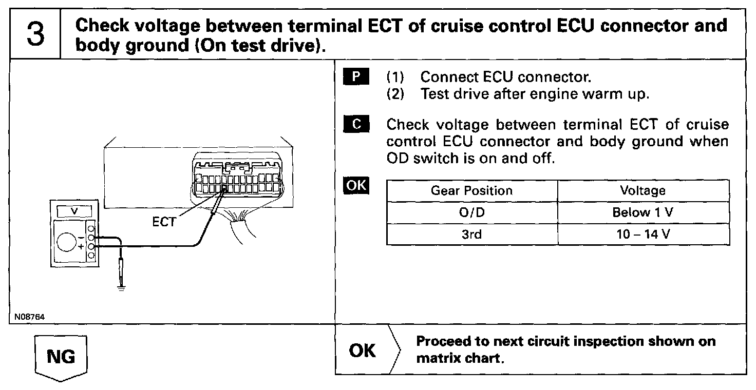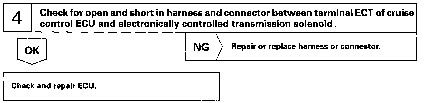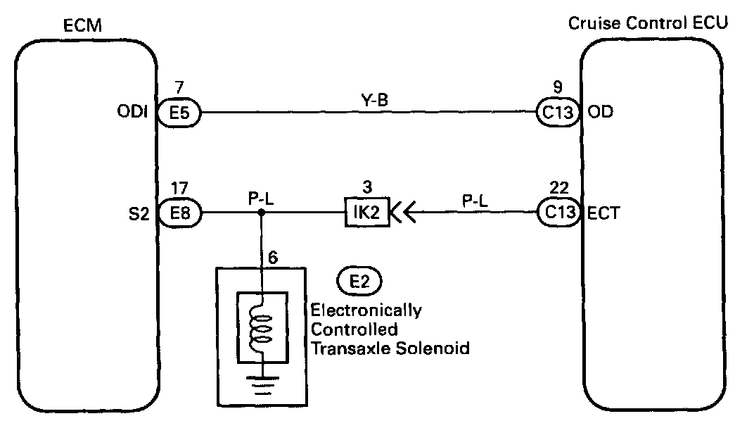 Terminal ECT of the cruise control ECU detects the shift change signal (output to electronic controlled transmission No.2 solenoid) from the electronically controlled transmission.