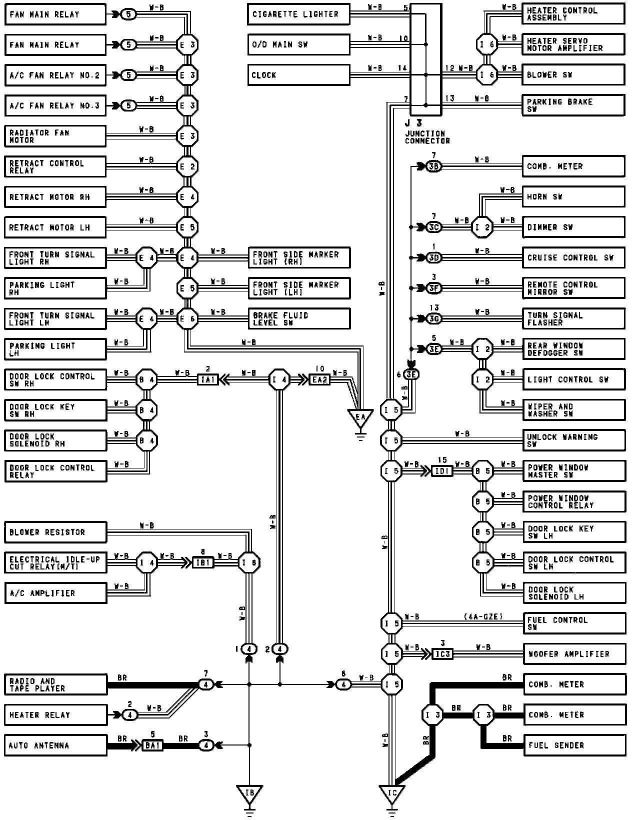 The ground points circuit diagram shows the connections from all major parts to the respective ground points. When troubleshooting a faulty ground point, checking the system circuits which use a common ground may help you identify the problem ground quickly. The relationship between ground points (EA, IB and IC shown below) can also be checked this way.
