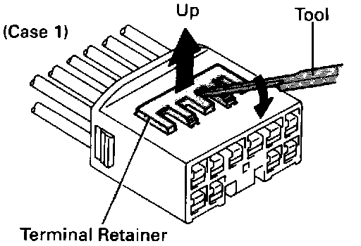 Insert the special tool into the terminal retainer access hole (Mark) and pull the terminal retainer up to the temporary lock position.