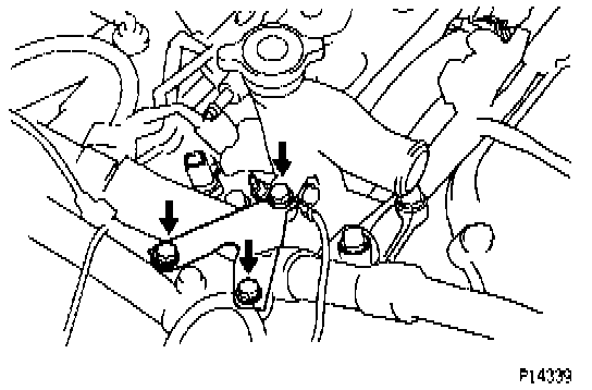 ^ Remove the 2 bolts, 2 nuts, 2 plate washers and water outlet.