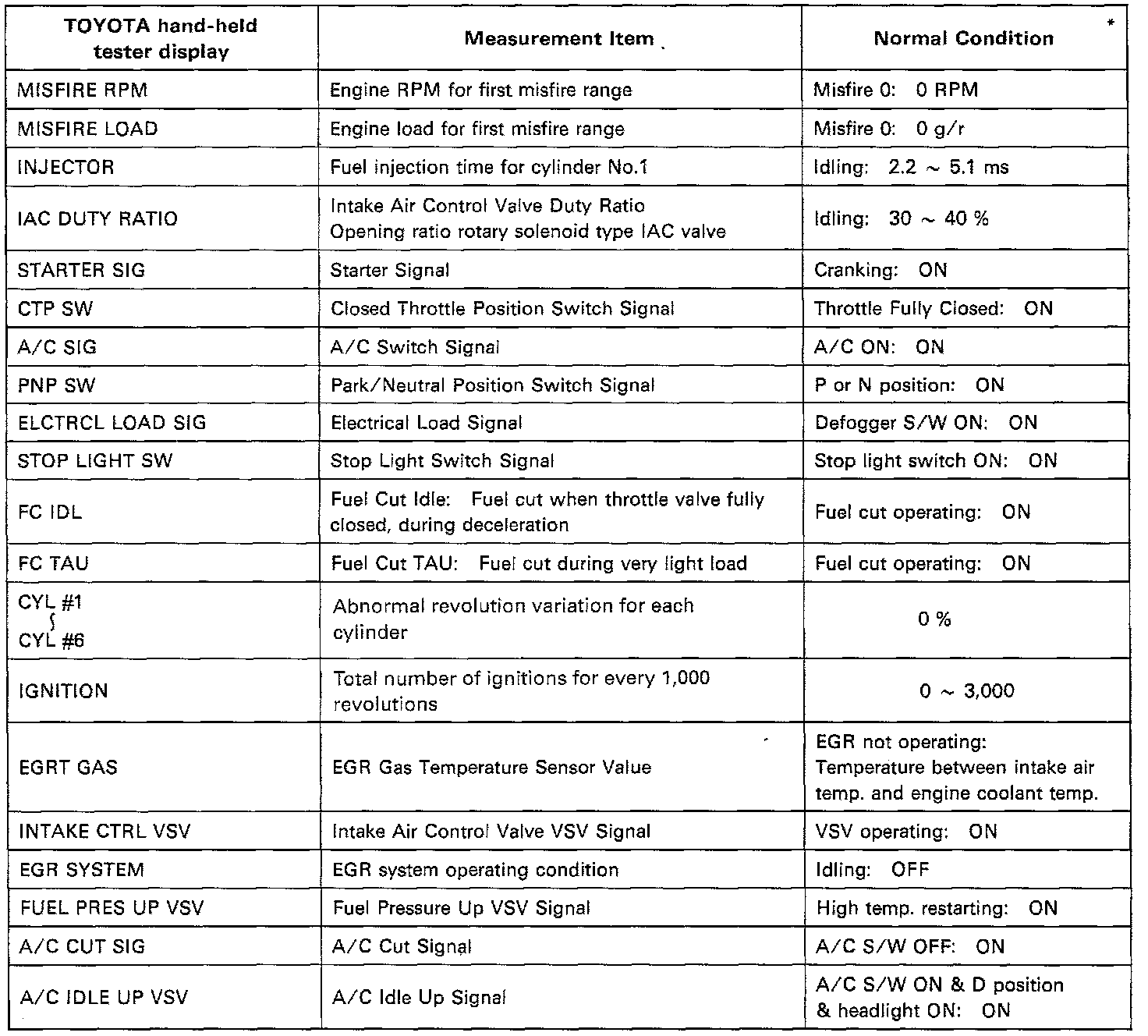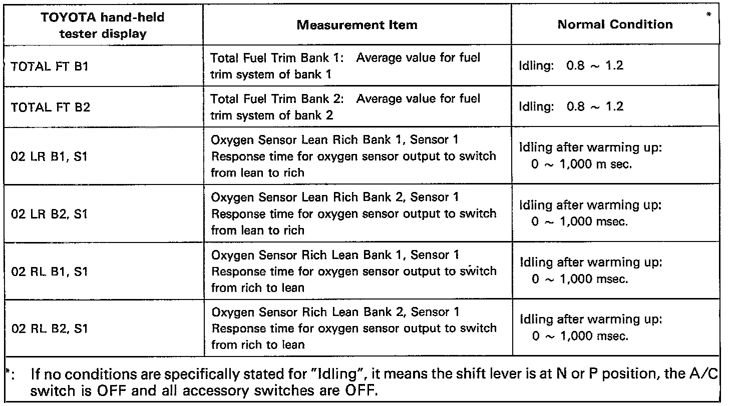 NOTICE: The values given below for "Normal Condition" are representative values, so a vehicle may still be normal even if its value varies from those listed here. So do not decide whether a part is faulty or not solely according to the "Normal Condition" here.CARB MANDATED SIGNALS