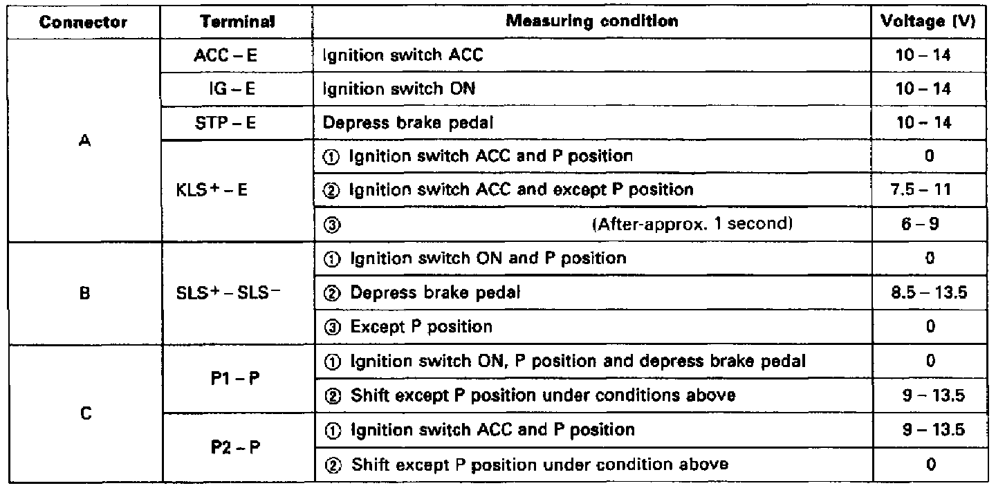 Using a suitable voltmeter, measure voltage at each terminal of the shift lock control ECU, Figs. 4 and 5.. Refer to Figs. 6 and 7 for measuring conditions and voltage specifications.