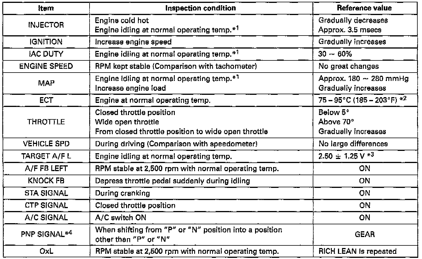 *2: If the engine coolant temp. sensor circuit is open or shorted, the ECM assumes an engine coolant temp. value of 8O°C (176°F).