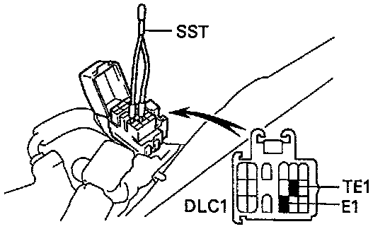 - Using a jumper wire (or SST 09843-18020), connect terminals TE1 and E1 of the data link connector (DLC1).