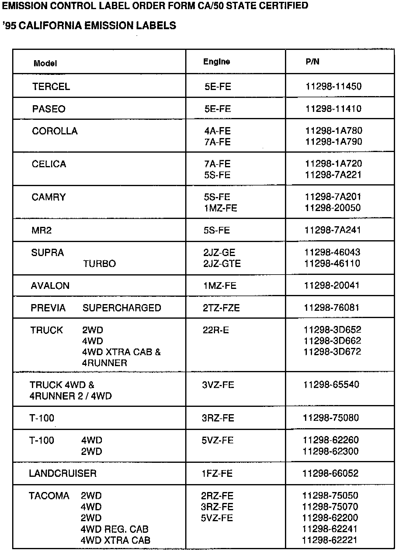 EMISSION CONTROL LABEL ORDER FORM CA/5O STATE CERTIFIED