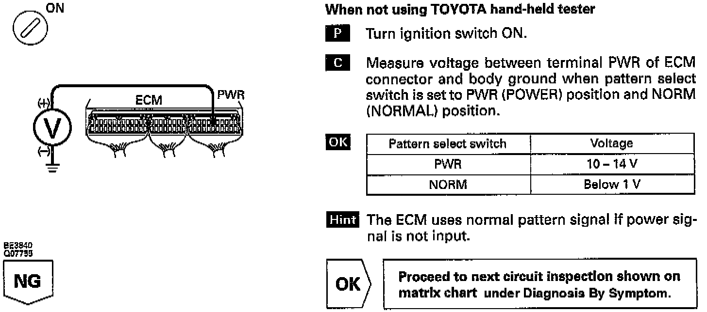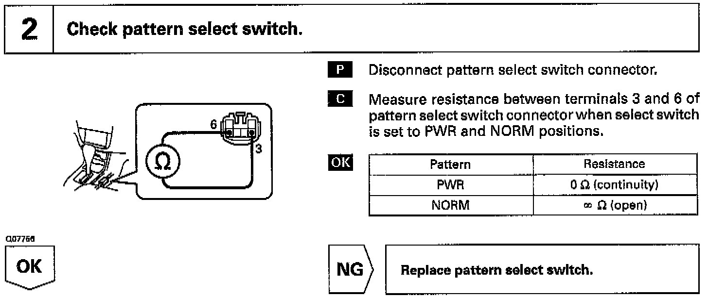 The ECM memory contains the shift programs for the NORMAL and POWER patterns, 2 position, and L position and the lock-up patterns. Following the programs corresponding to the signals from the pattern select switch, the park/neutral position switch and other various sensors, the ECM switches the solenoid valves ON and OFF, thereby controlling the transaxle gear change and the lock-up clutch operation.