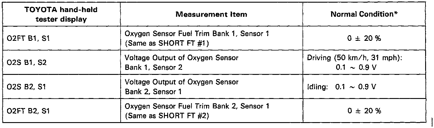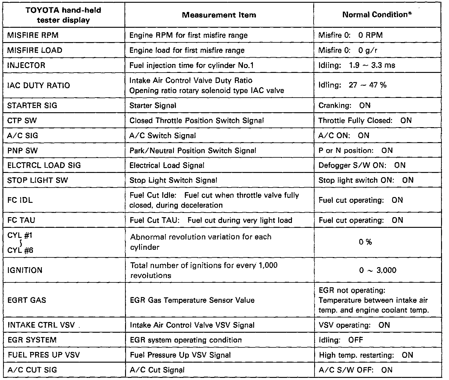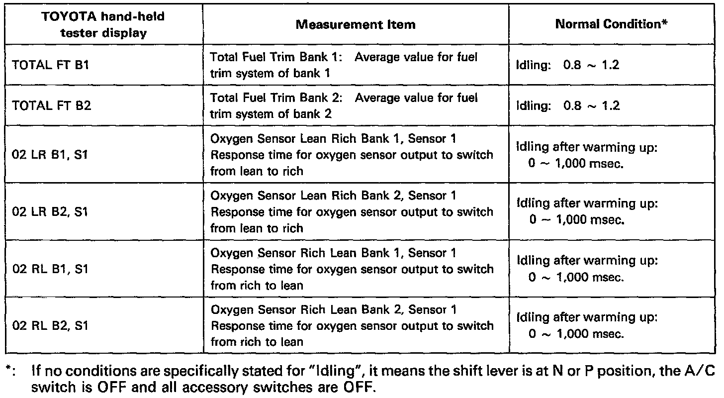 NOTICE: The values given below for "Normal Condition" are representative values, so a vehicle may still be normal even if its value varies from those listed here. So do not decide whether a part is faulty or not solely according to the "Normal Condition" here.CARB Mandated Signals