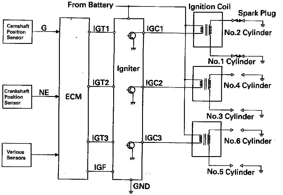 The ECM determines ignition timing and outputs the ignition signals (IGT) for each cylinder. Based on IGT signals, the igniter controls the primary ignition signals (IGC) for all ignition coils. At the same time the igniter also sends an ignition confirmation signal (IGF) as a fail-safe measure to the ECM.