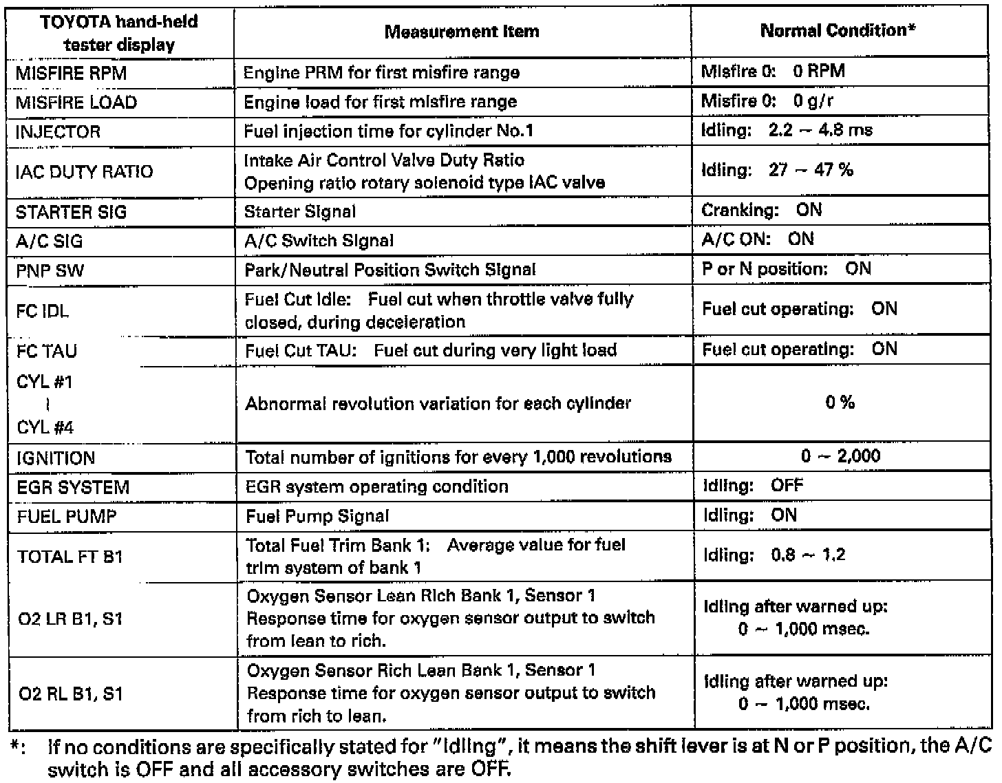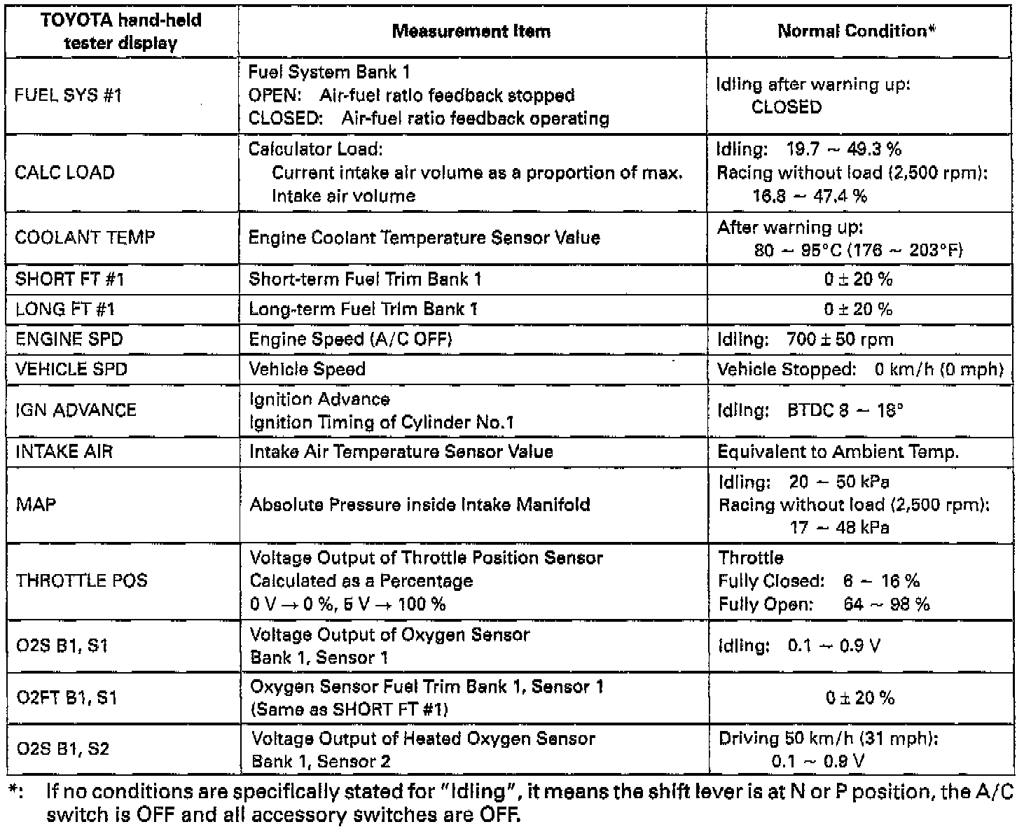 NOTICE: The values given below for "Normal Condition" are representative values, so a vehicle may still be normal even if its value varies from those listed here. So do not decide whether a part is faulty or not solely according to the "Normal Condition" here