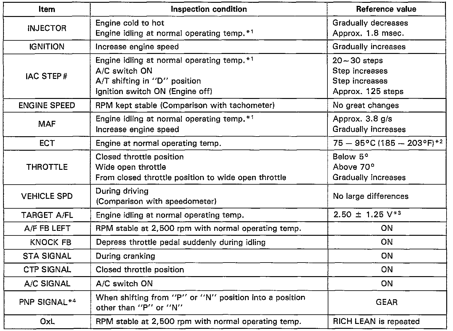 *2: If the engine coolant temp. sensor circuit is open or shorted, the ECM assumes an engine coolant temp. value of 80°C (176°F).