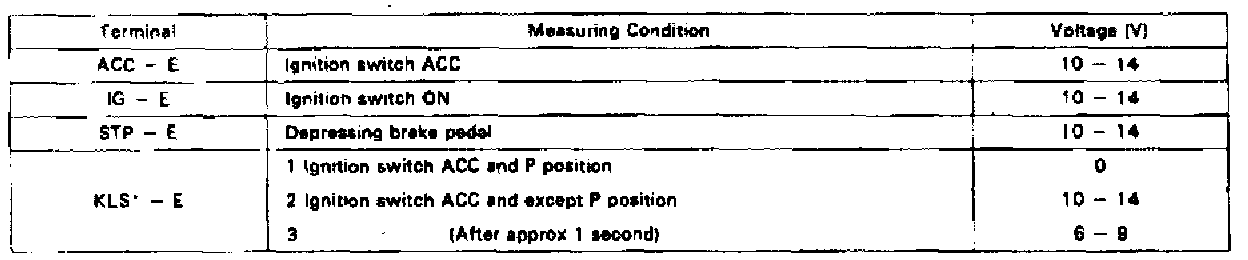 Using a suitable voltmeter, measure voltage at each terminal of the shift lock ECM connector, Fig. 3. Refer to Fig. 4 for measuring conditions and voltage specifications.