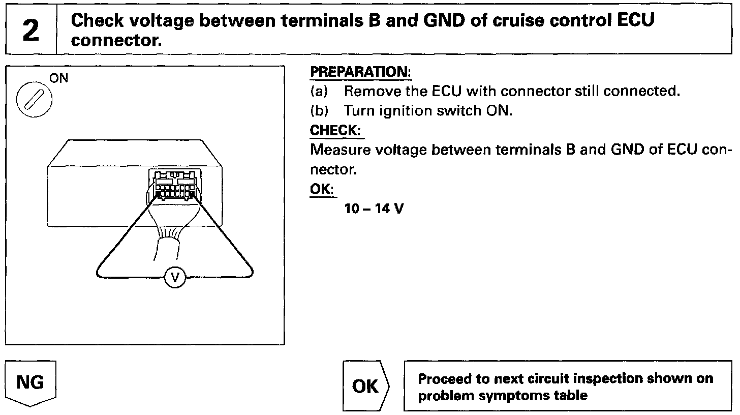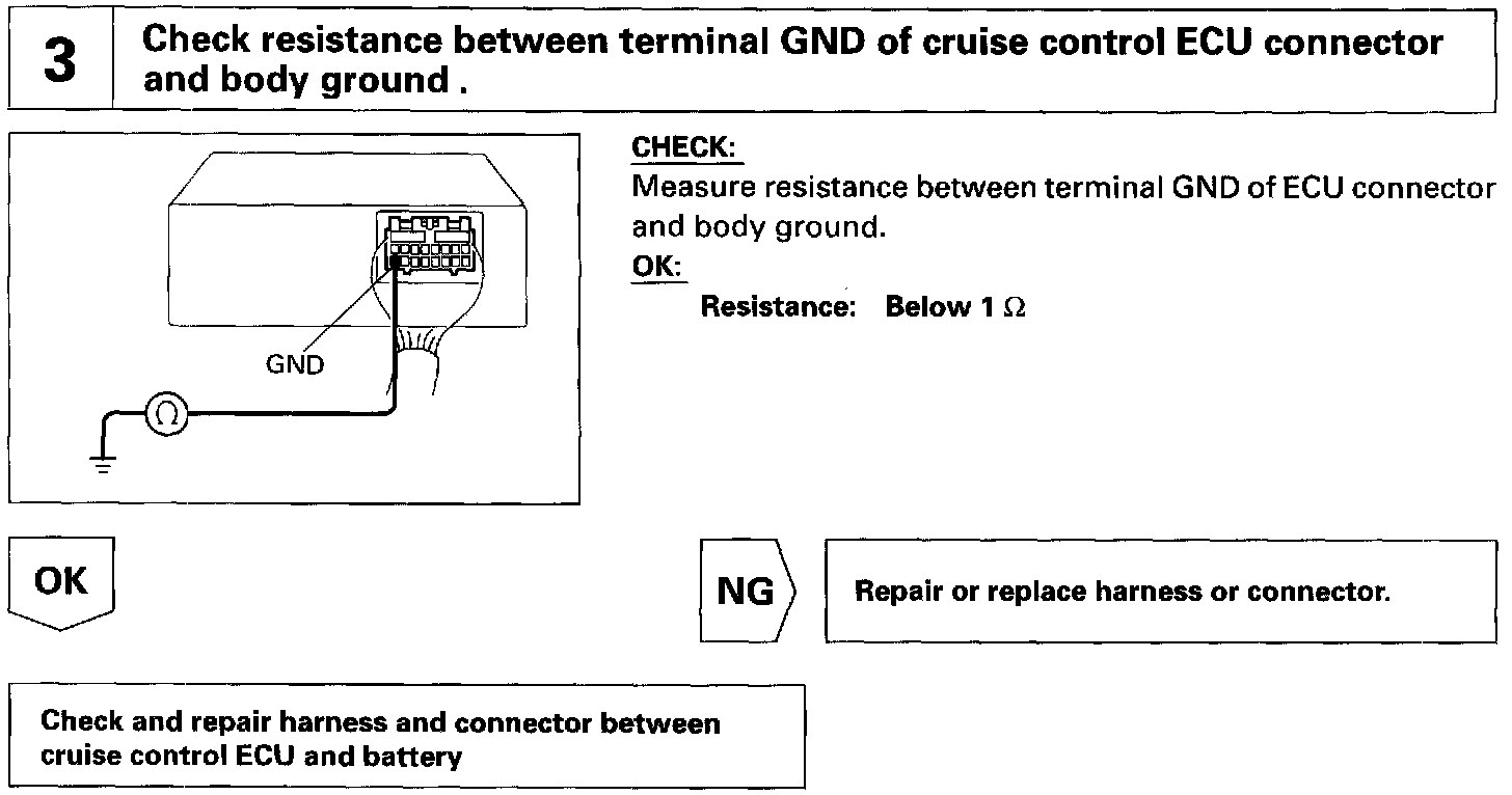 The ECU power source supplies power to the actuator and sensors, etc., when the terminal GND and the cruise control ECU case are grounded.