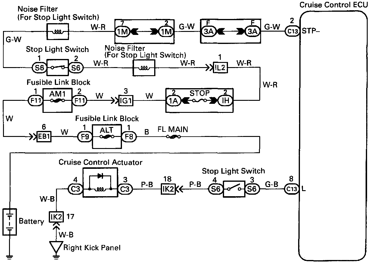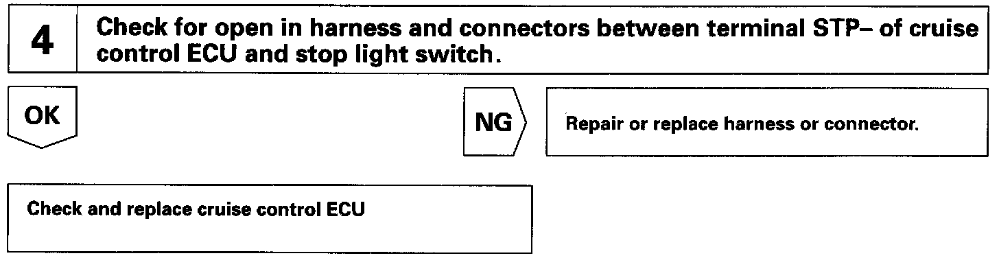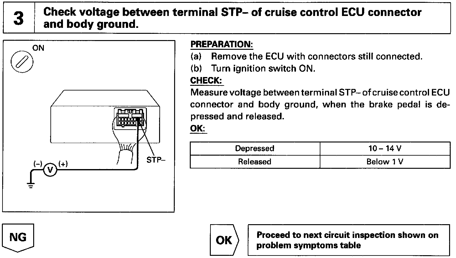 When the brake is ON, battery positive voltage normally applies through the STOP fuse and stop light switch to terminal STP- of the ECU, and the ECU turns the cruise control OFF.
