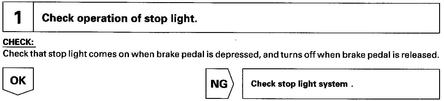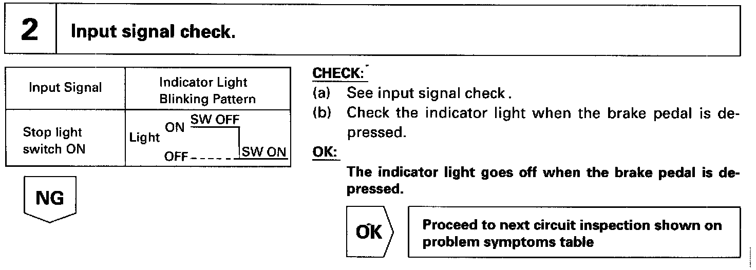 When the brake pedal is depressed, the stop light switch sends a signal to the ECU. When the ECU receives this signal, it cancels the cruise control.