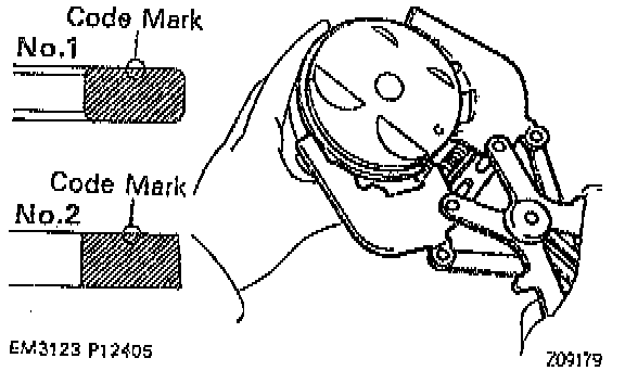 (b) Using a piston ring expander, install the 2 compression rings with the code mark facing upward.