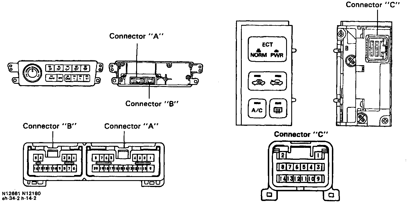 b. Connect the positive (+) lead from the battery to terminal C-8 and check that the mode indicator dims. If operation is not as specified. replace the A/C control upper panel.