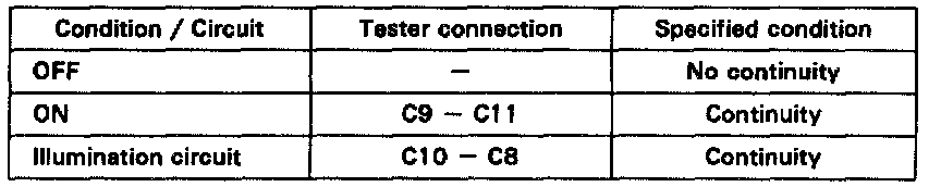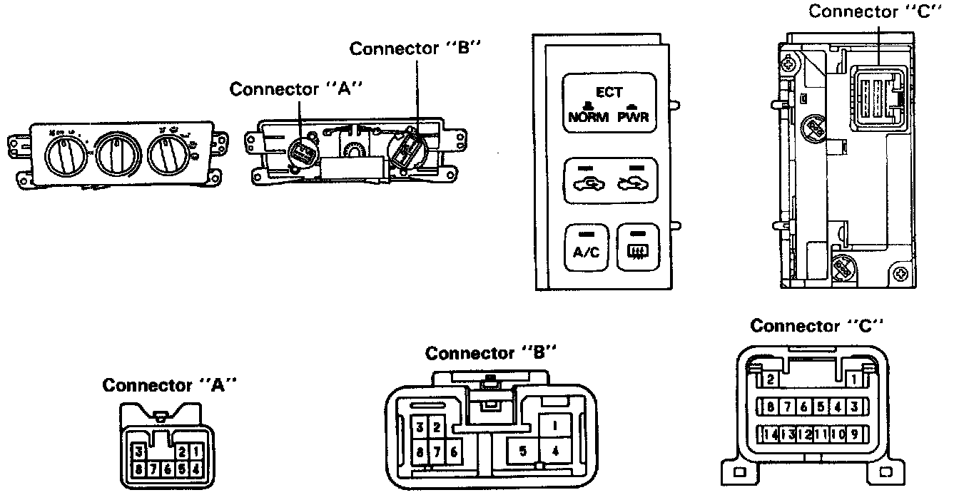 b. Connect the positive (+) lead from the battery terminal C-8 and check that the mode indicator dims. If operation is not as specified, replace the A/C control upper panel.