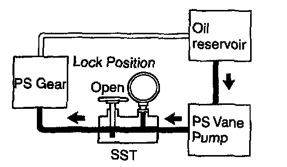 4. Check fluid pressure reading with valve closed. With the engine idling, close the valve of the SST and observe the reading on the gauge.