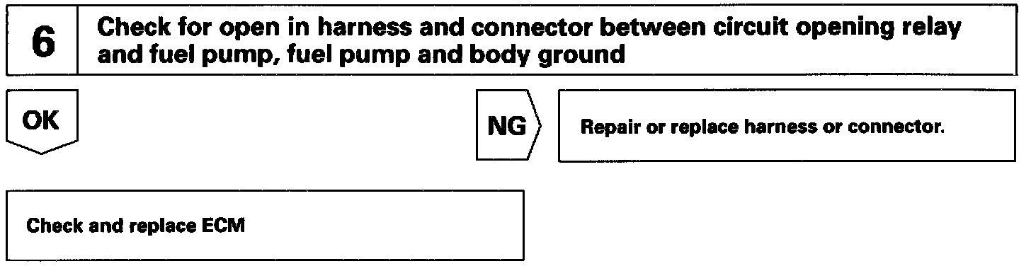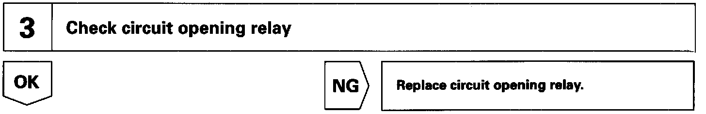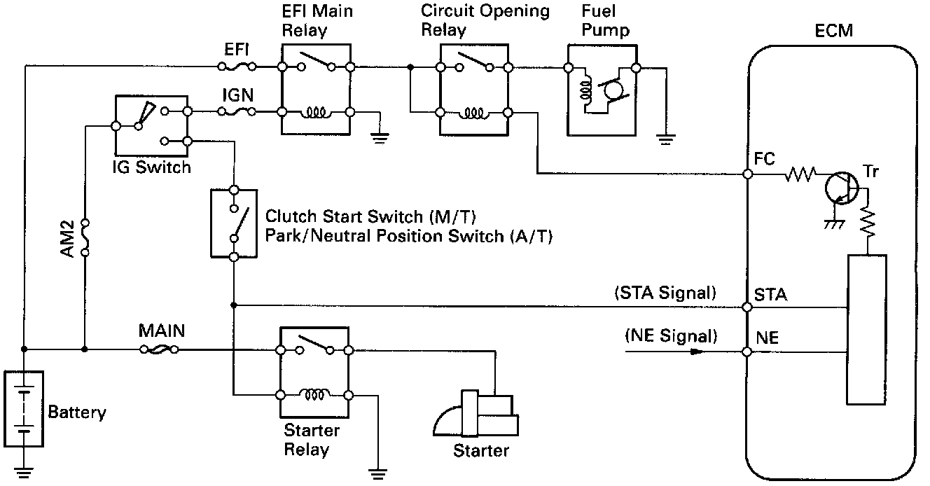 When the STA signal and NE signal are input to the ECM, Tr is turned ON, current flows to coil of the circuit opening relay, the relay switches on, power is supplied to the fuel pump and the fuel pump operates. While the NE signal is generated (engine running), the ECM keeps Tr ON (circuit opening relay ON) and the fuel pump also keeps operating.