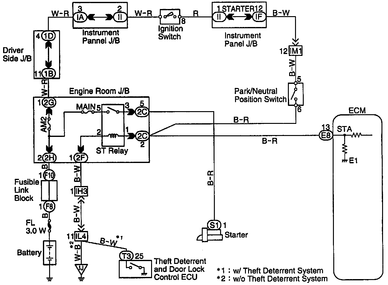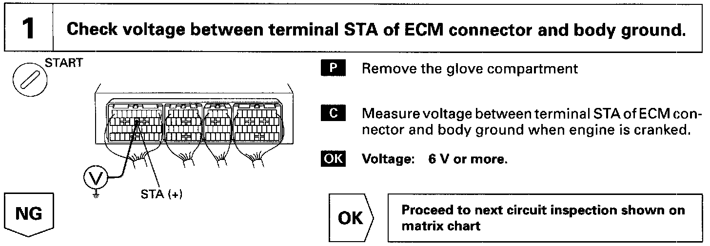 When the engine is cranked, the intake air flow is slow, so fuel vaporization is poor. A rich mixture is therefore necessary in order to achieve good startability. While the engine is being cranked, the battery positive voltage is applied to terminal STA of the ECM. The starter signal is mainly used to increase the fuel injection volume for the starting injection control and after-start injection control.