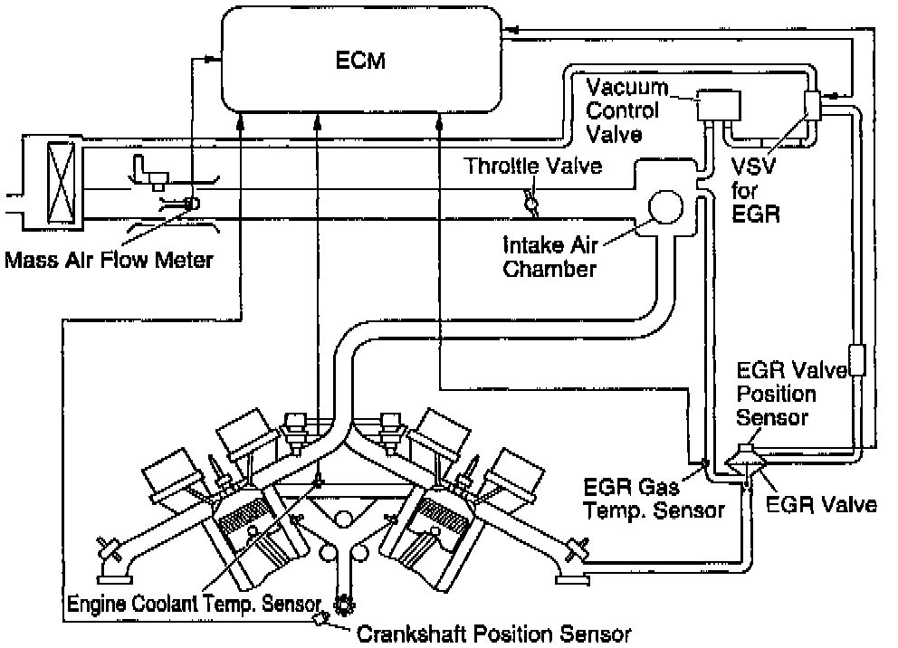 The lift amount of EGR valve is controlled by the vacuum which is regulated by the Duty-VSV operated by the ECM. The lift amount of EGR valve is detected by the EGR valve position sensor which is mounted on the EGR valve and it provides feedback to the ECM to control the lift amount of EGR valve in response to engine operating conditions.