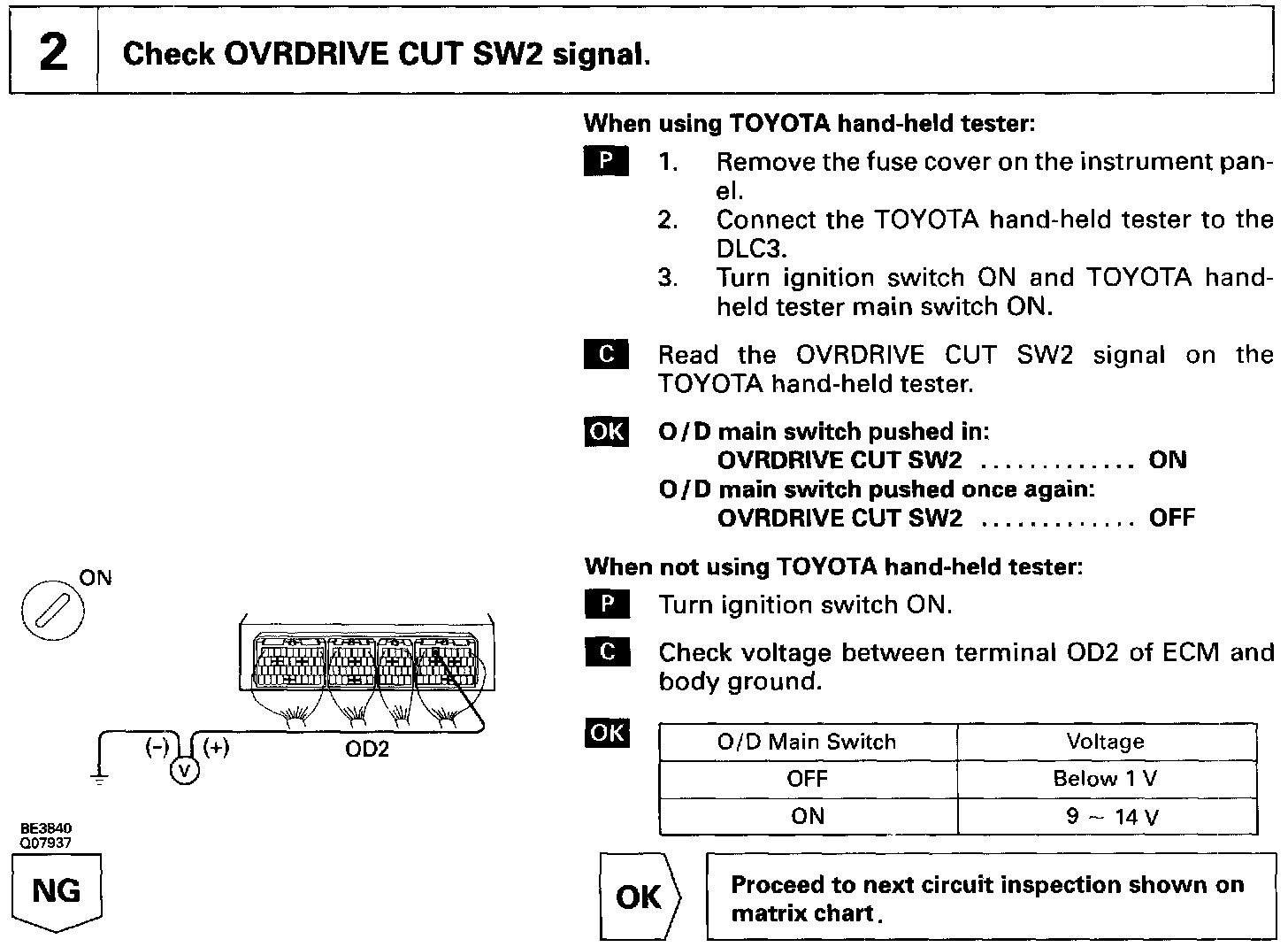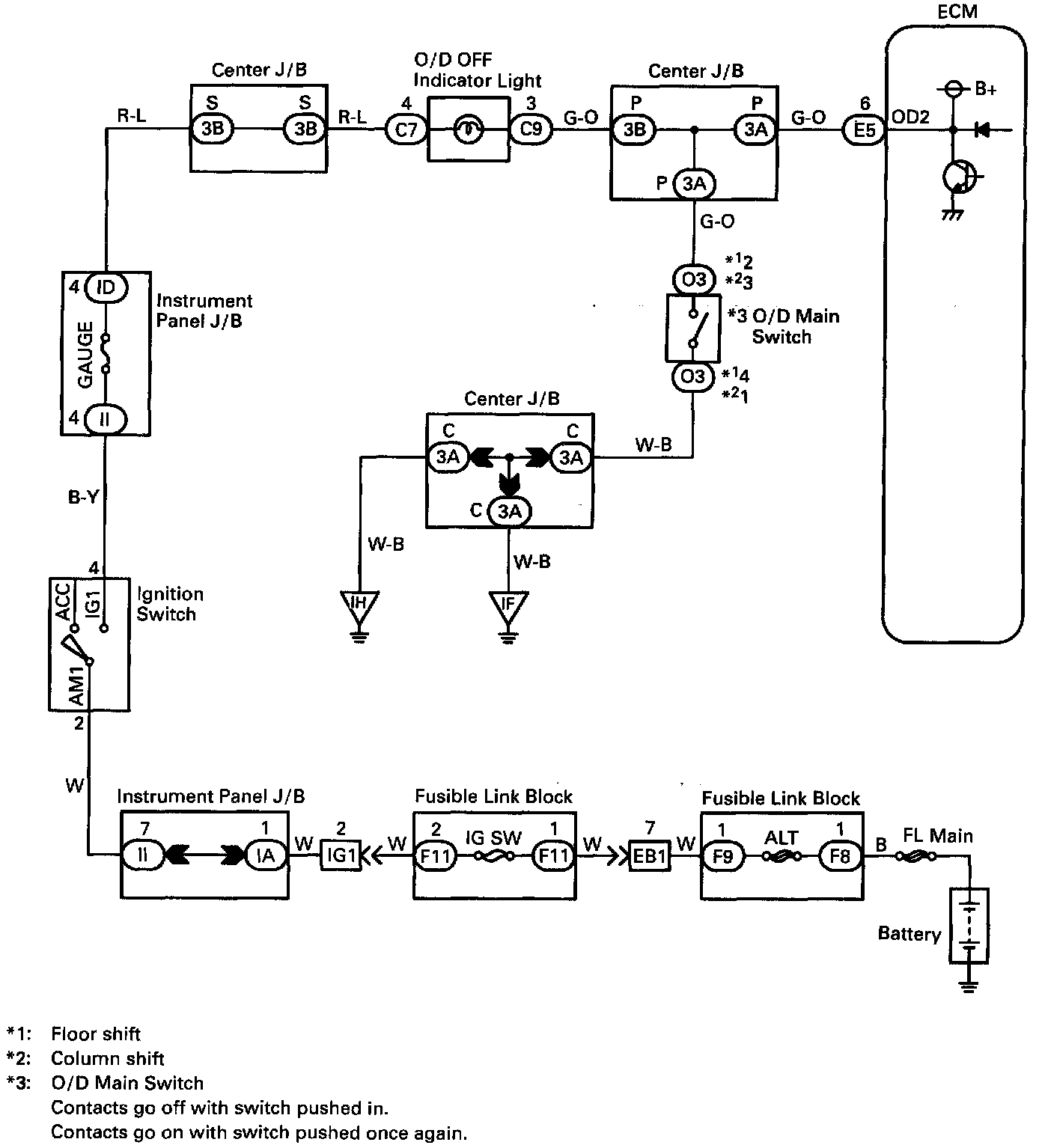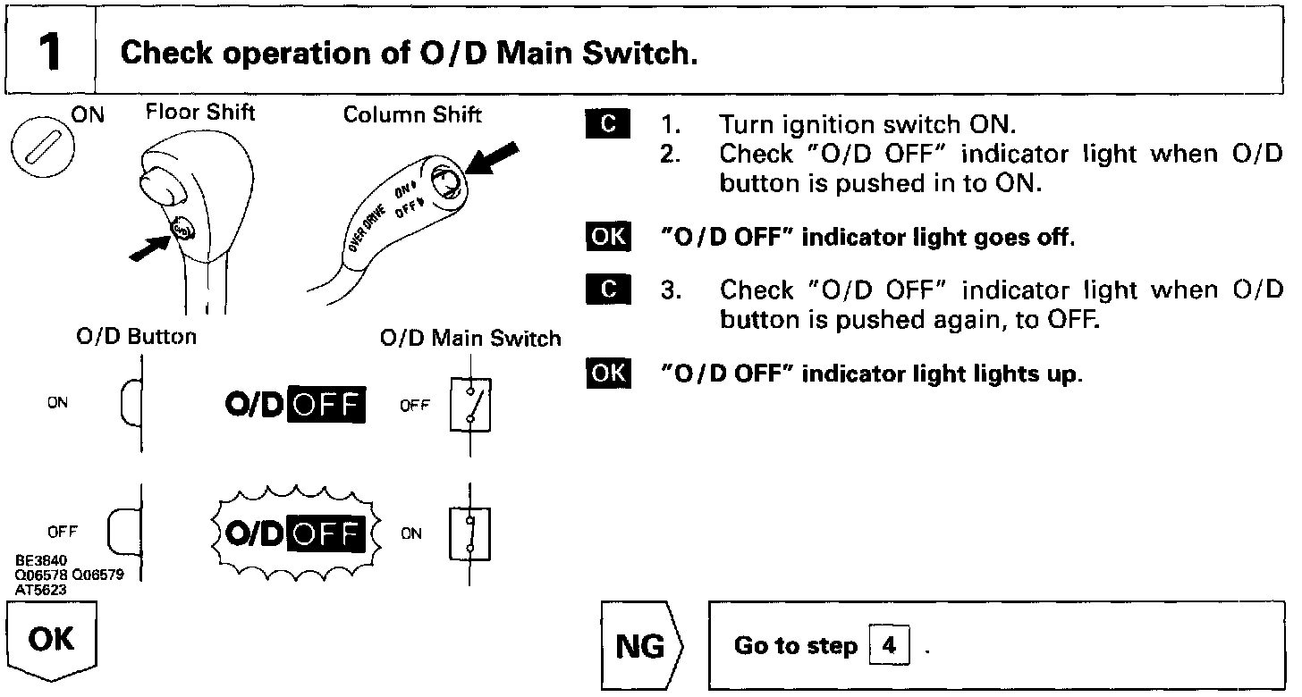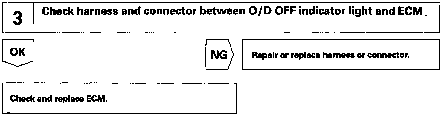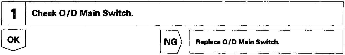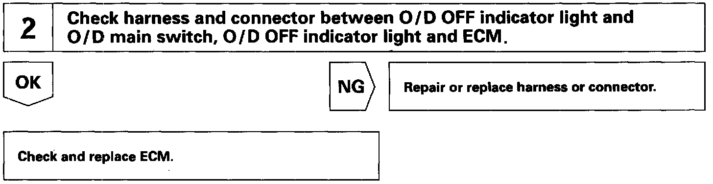 The O/D main switch contacts go off when the switch is pushed in and come on when it is pushed out. In O/D main switch OFF position, the O/D OFF indicator lights up and the ECM prohibits shifting to O/D.