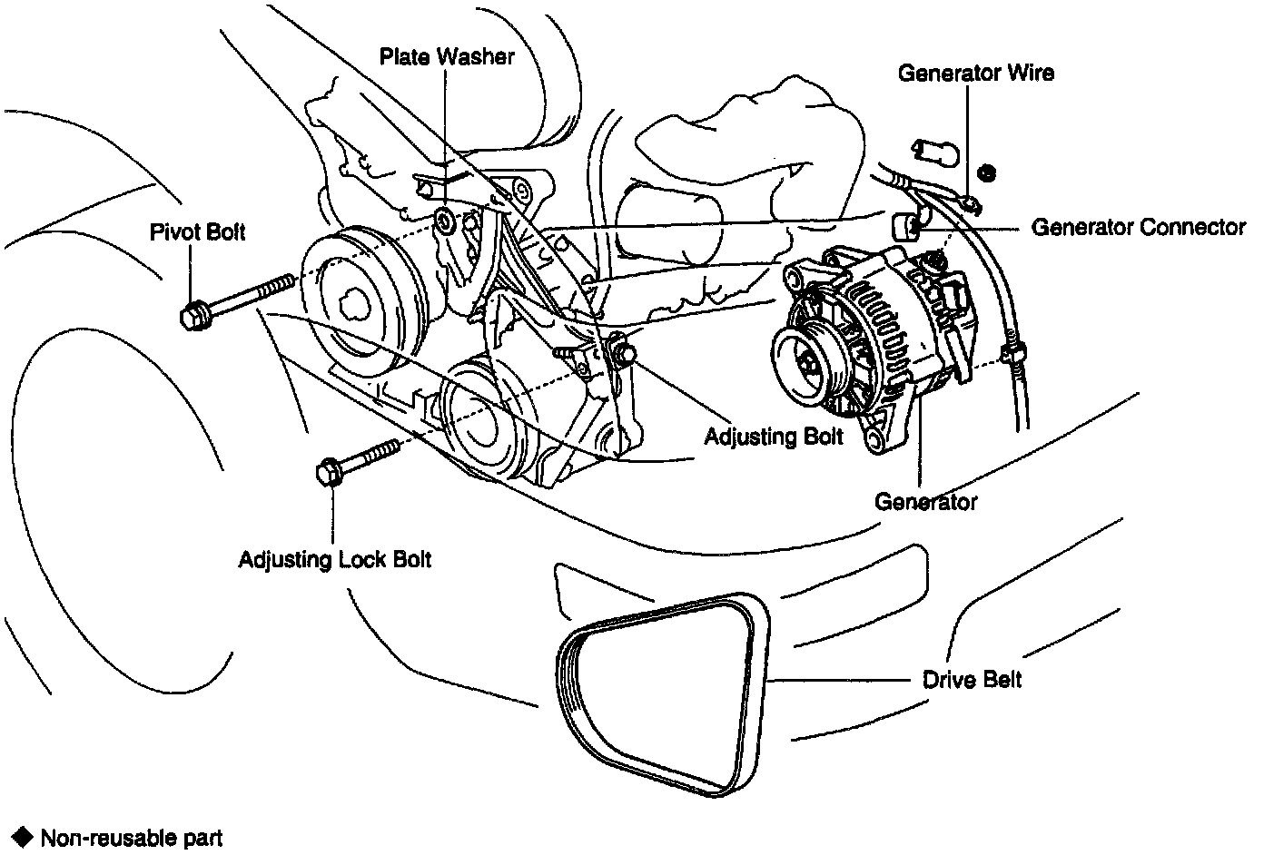 d. Remove the pivot bolt, plate washer, adjusting lock bolt and generator.