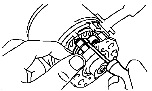 c. Using a screwdriver, hold the spring back and disconnect the brush from the brush holder. Disconnect the 4 brushes, and remove the brush holder.