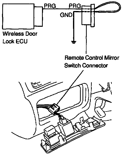 (a) The wireless door lock ECU and remote control mirror switch are connected to each other via a PRG terminal, and the GND terminal of the remote control mirror switch connector is grounded to body. Remove the connector from the remote control mirror switch, which is attached under the wireless door lock ECU, and use a test lead to short the PRG and GND connector together. As a result, the PRG terminal of the wireless door lock ECU will be grounded to body and will cause all transmitter recognition codes previously registered in the EEPROM to be erased. At the same time, the ECU will respond by operating once the lock and unlock functions of a the doors, and the open function.