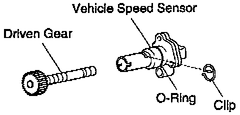b. Remove the clip and speedometer driven gear from vehicle speed sensor.