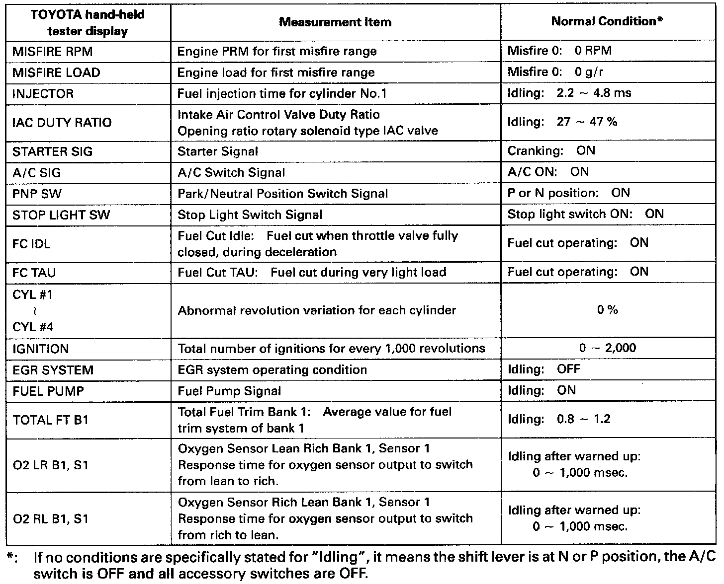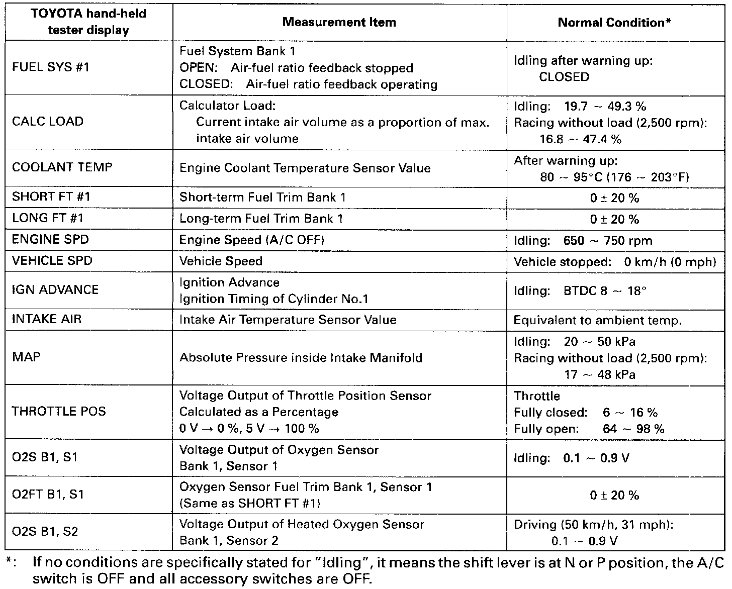 NOTICE: The values given below for "Normal Condition" are representative values, so a vehicle may still be normal even if its value varies from those listed here. So do not decide whether a part is faulty or not solely according to the "Normal Condition" here.