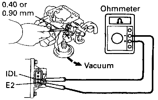 (d) Connect the test probe of an ohmmeter to the terminals IDL and E2 of the throttle position sensor.
