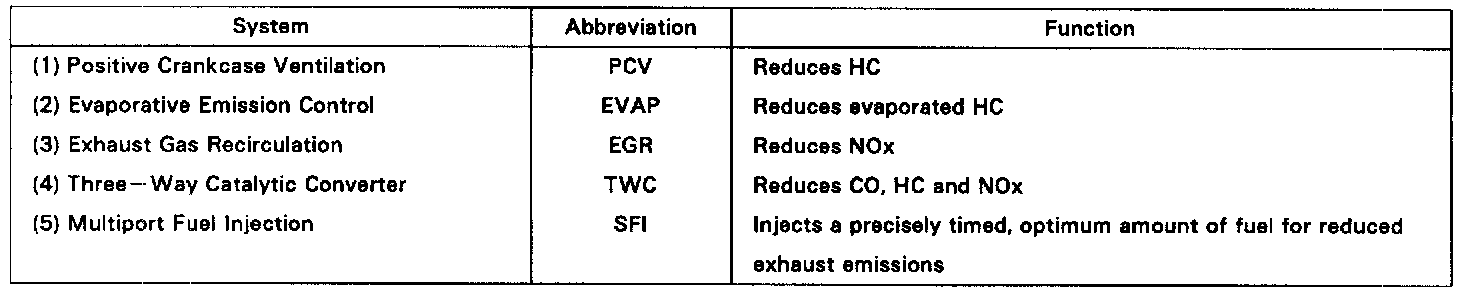 The emission control systems are installed to reduce the amount of CO, HC and NOx exhausted from the engine ((3), (4) and (5)), to prevent the atmospheric release of blow-by gas-containing HC (1) and evaporated fuel containing HC being released from the fuel tank (2).