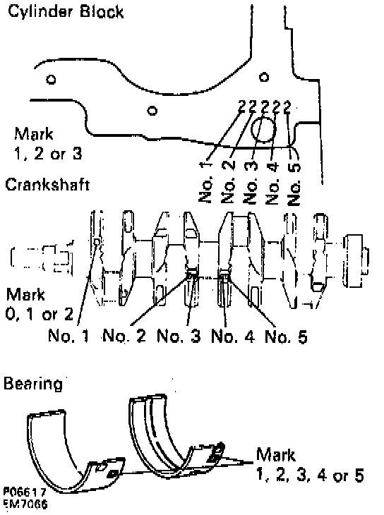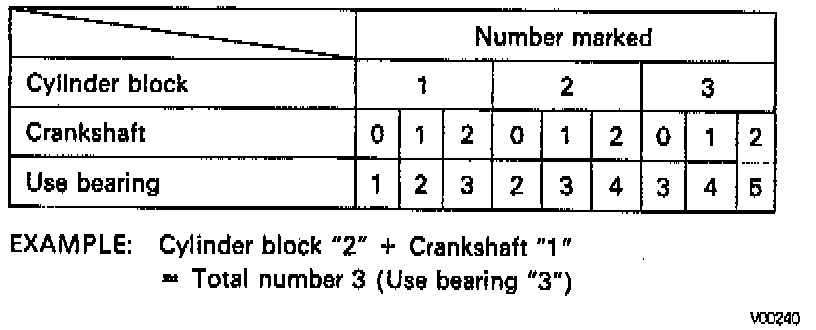 NOTE: If using a standard bearing, replace it with one having the same number. If the number of the bearing cannot be determined, select the correct bearing by adding together the numbers imprinted on the cylinder block and crankshaft, then selecting the bearing with the same number as the total. There are 5 sizes of standard bearings, marked "1","2","3","4" and "5" accordingly.