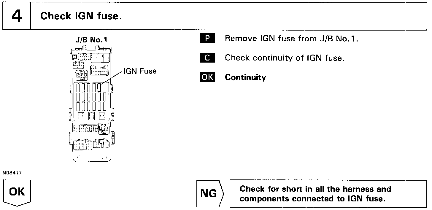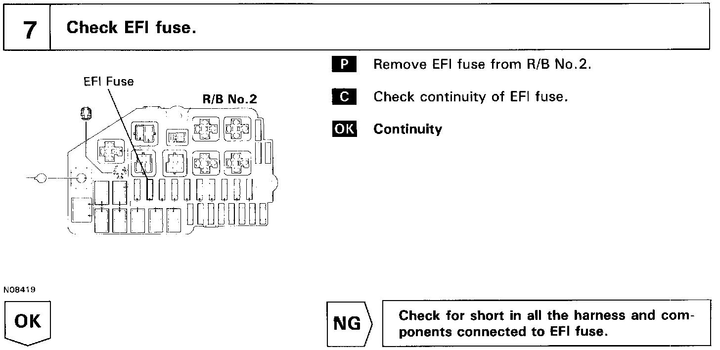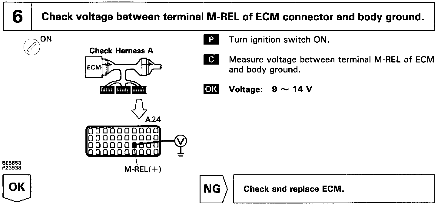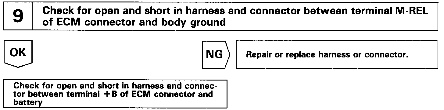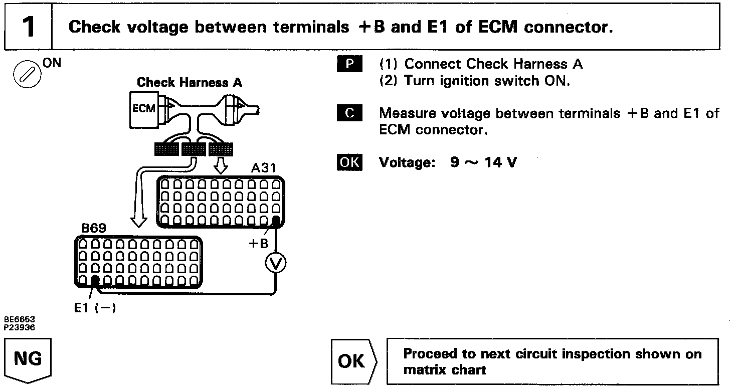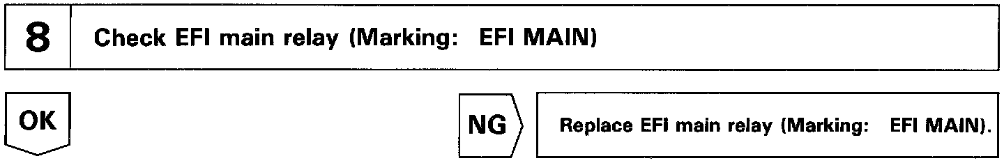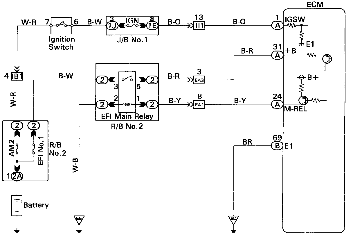 When the ignition switch is turned ON, battery positive voltage is applied to the coil, closing the contacts of the EFI main relay and supplying power to the terminals +B of the ECM.