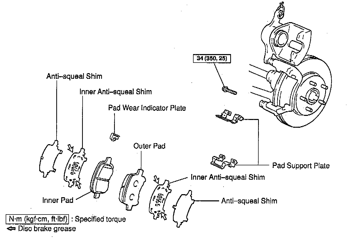 b. Apply disc brake grease to both sides of the inner anti-squeal shims.