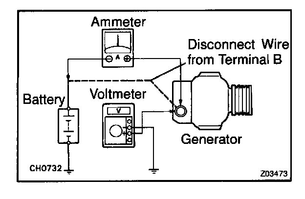 ^ Disconnect the wire from terminal B of the generator, and connect it to the negative (-) tester probe of the ammeter