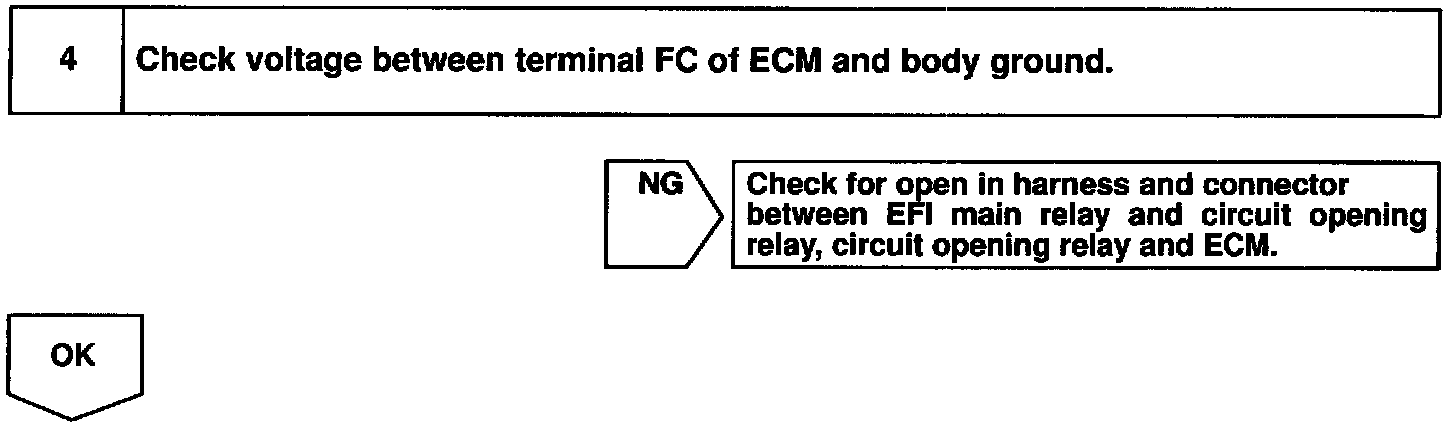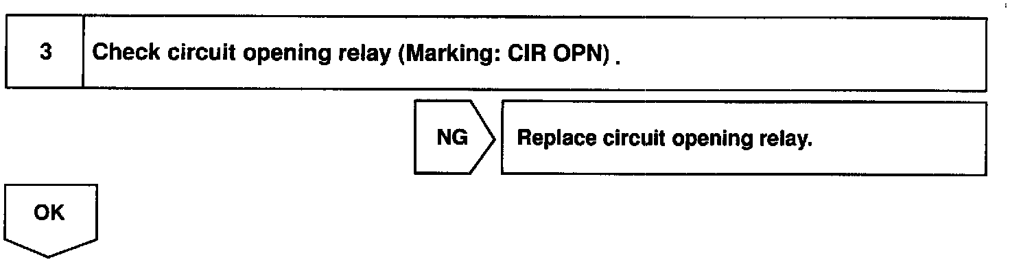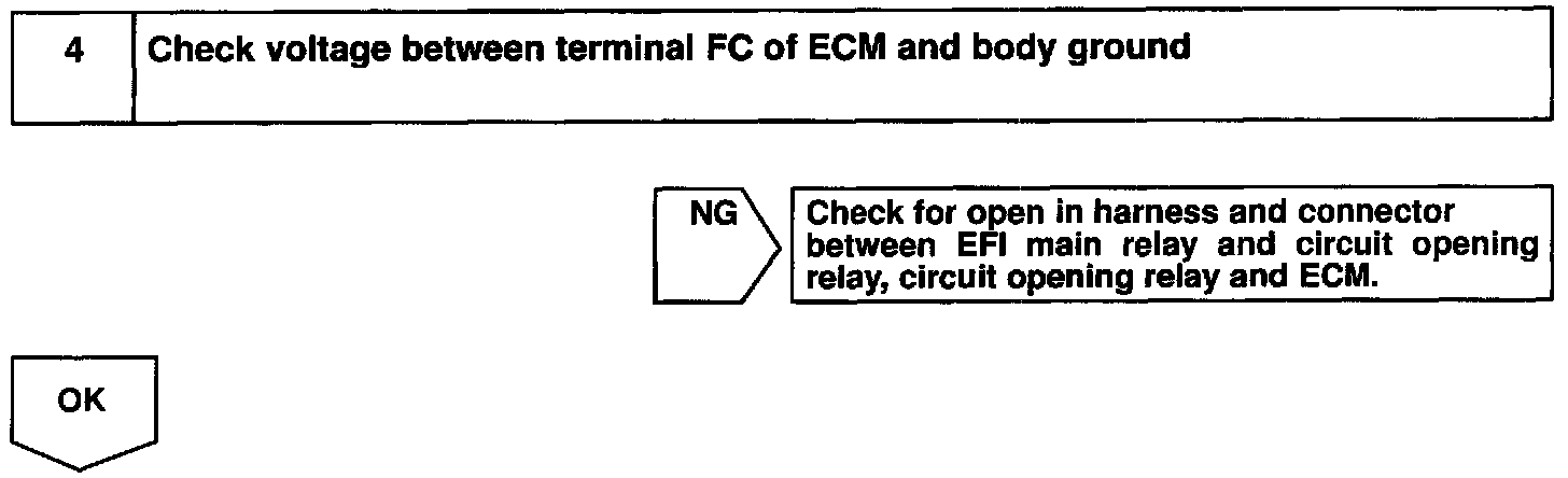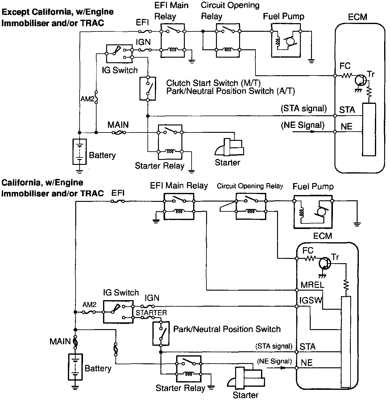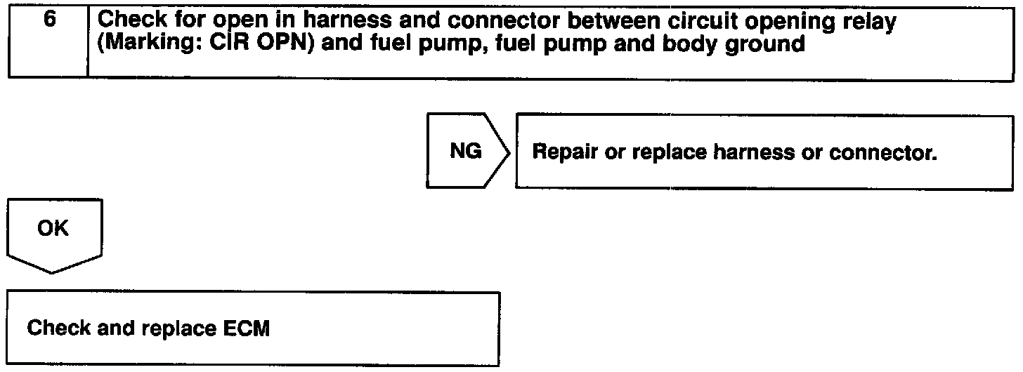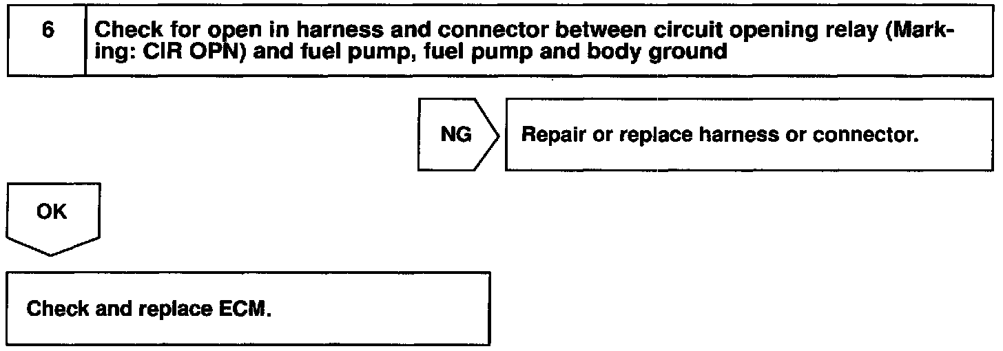 When the STA signal and NE signal are input to the ECM, Tr is turned ON, current flows to coil of the circuit opening relay, the relay switches on, power is supplied to the fuel pump and the fuel pump operates. While the NE signal is generated (engine running), the ECM keeps Tr ON (circuit opening relay ON) and the fuel pump also keeps operating.