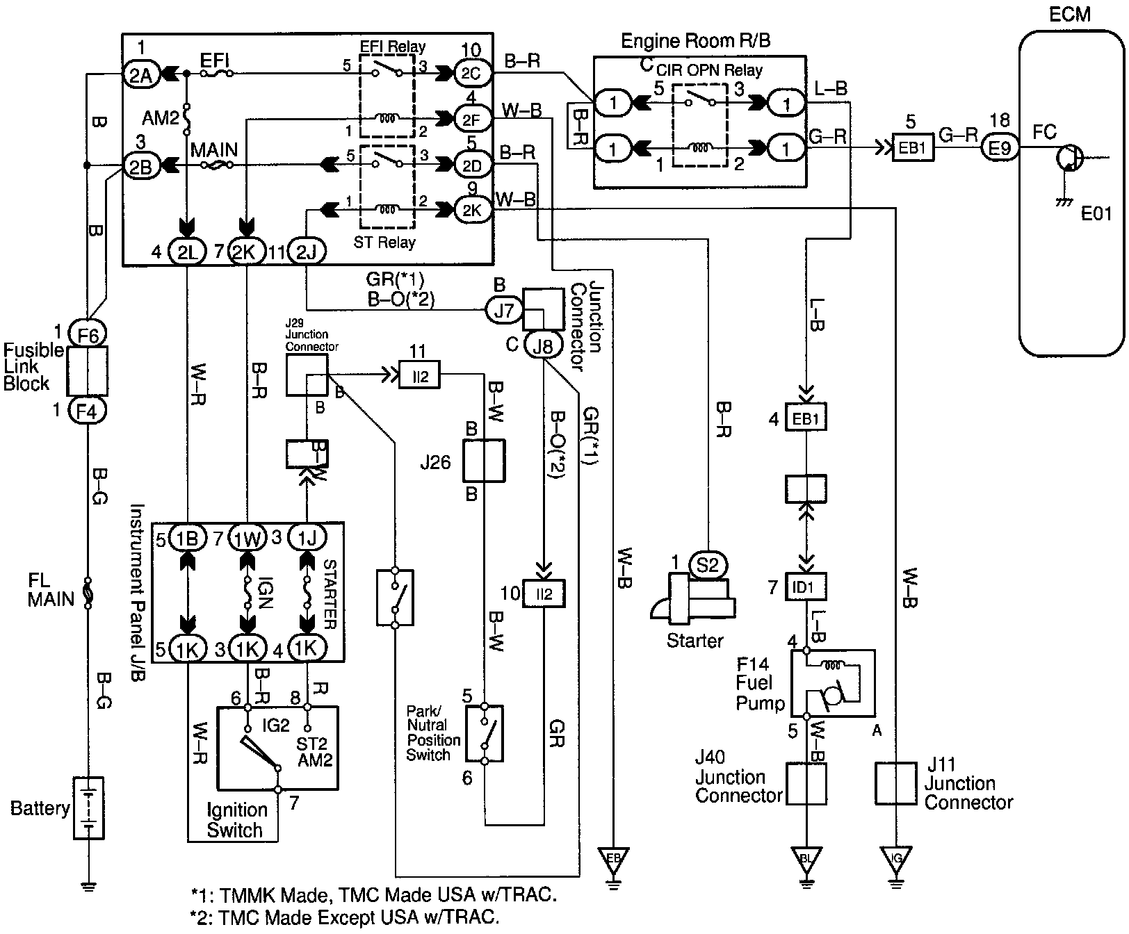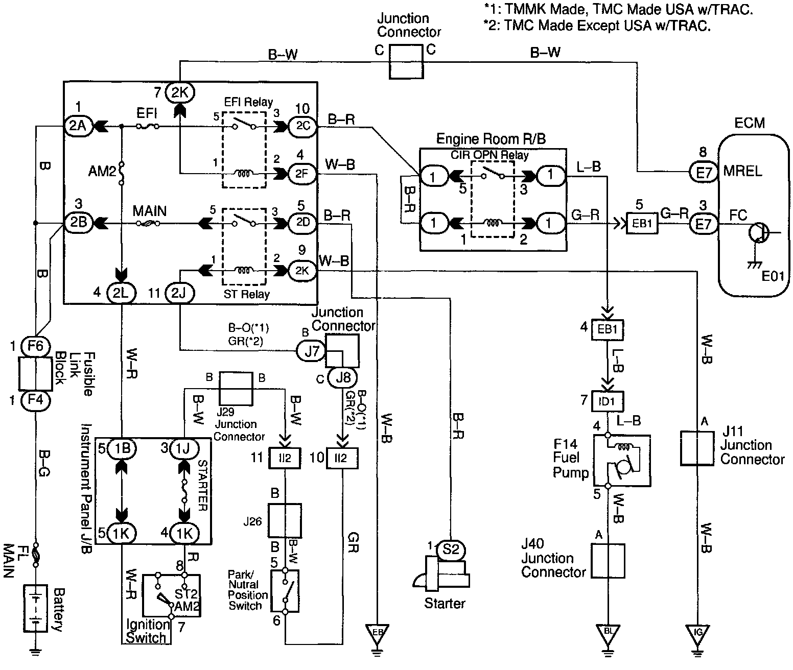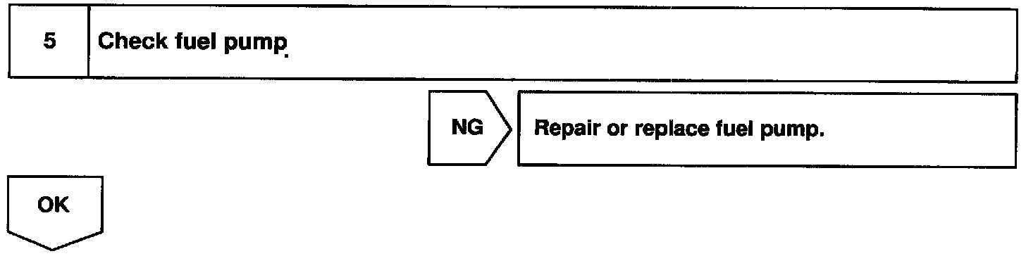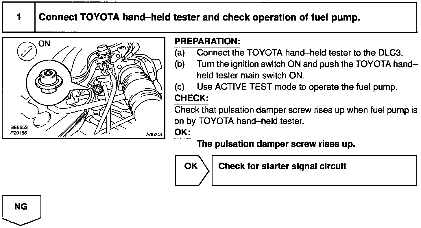 When the STA signal and NE signal are input to the ECM, Tr is turned ON, current flows to coil of the circuit opening relay, the relay switches on, power is supplied to the fuel pump and the fuel pump operates. While the NE signal is generated (engine running), the ECM keeps Tr ON (circuit opening relay ON) and the fuel pump also keeps operating.