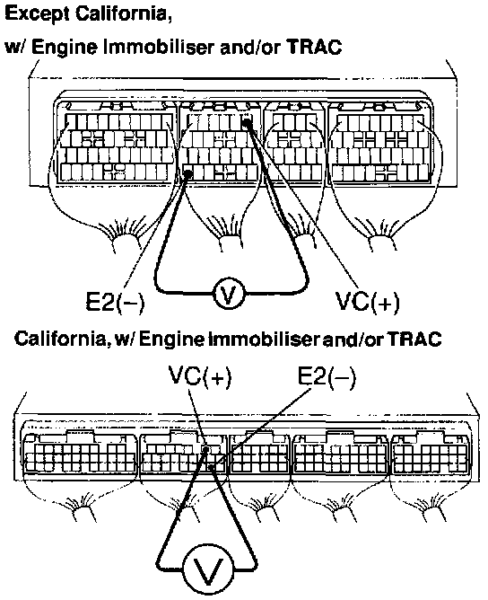 (c) Connect a voltmeter to terminals VC and E2 of the ECU and measure the power source voltage.