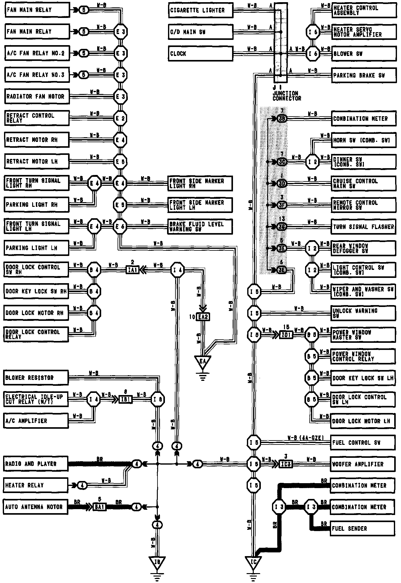 The ground points circuit diagram shows the connections from all major parts to the respective ground points. When troubleshooting a faulty ground point, checking the system circuits which use a common ground may help you identify the problem ground quickly. The relationship between ground points (EA, IB and IC shown) can also be checked this way.