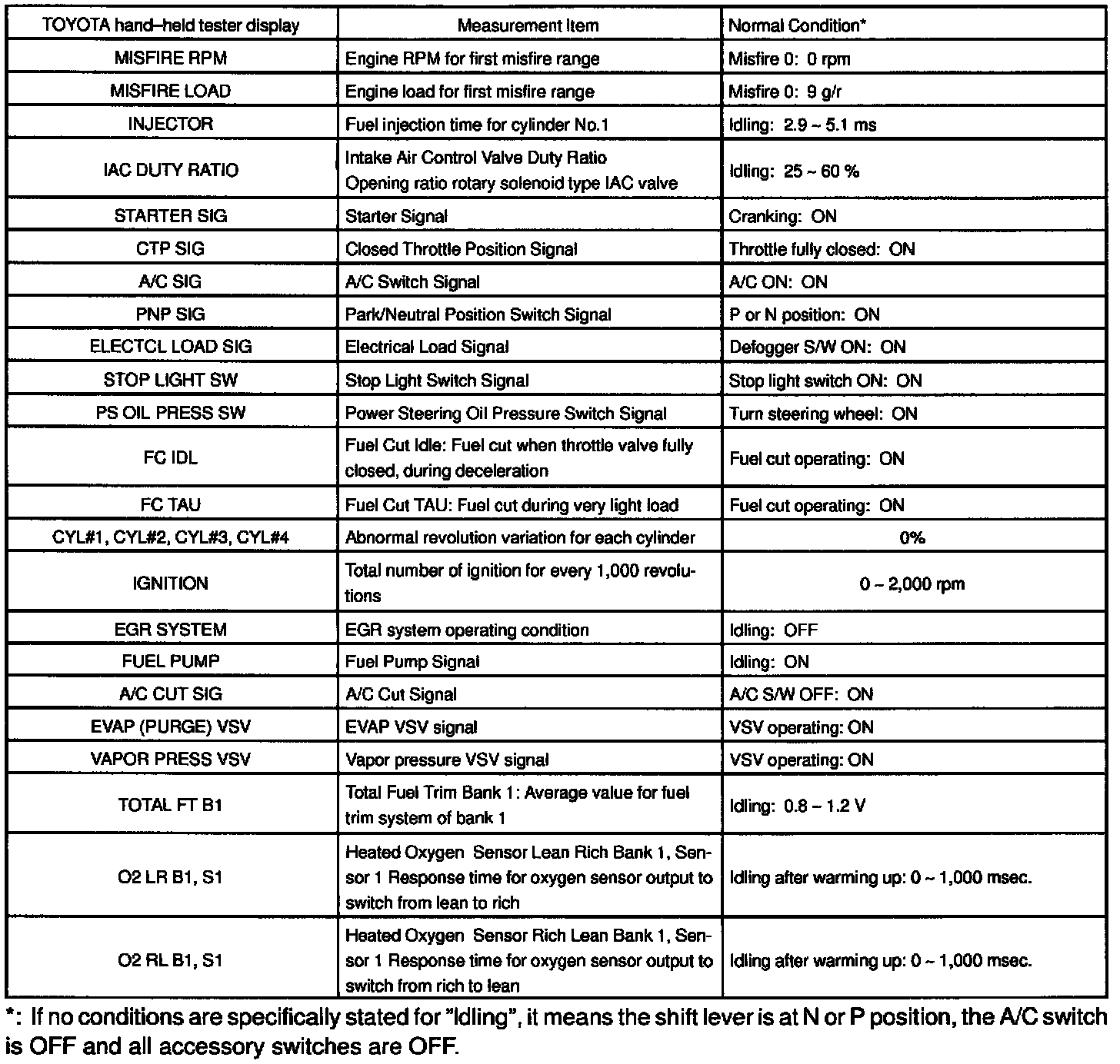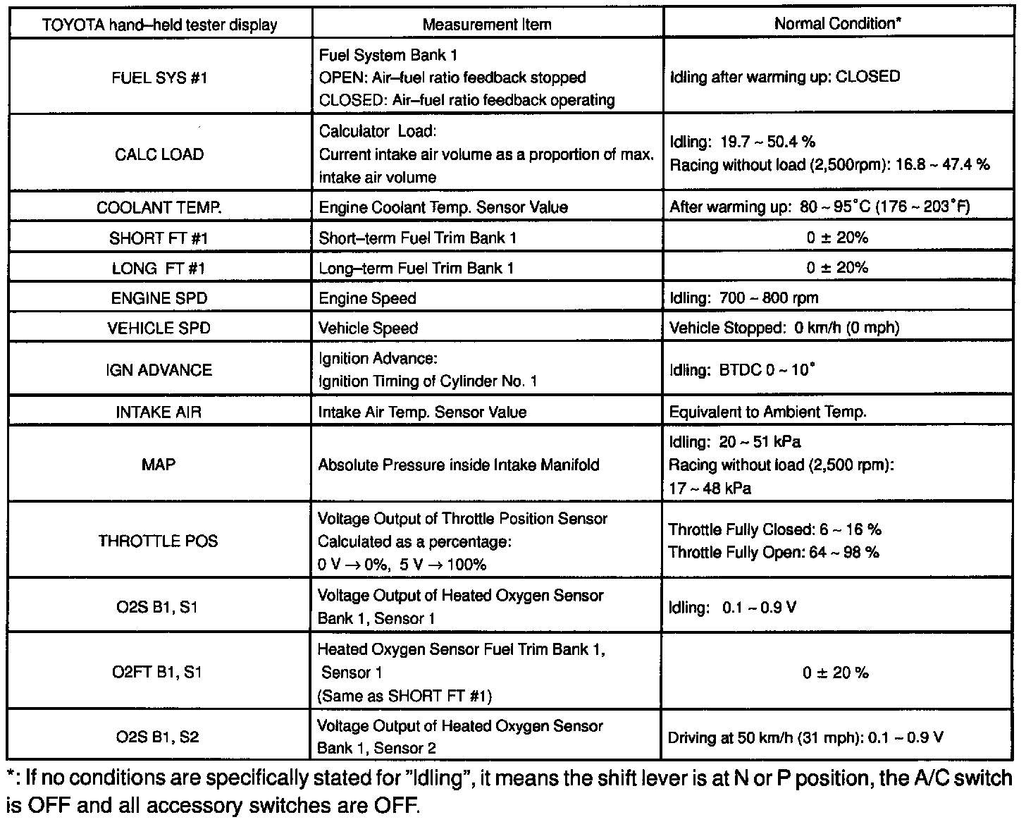 NOTICE: The values given below for "Normal Condition" are representative values, so a vehicle may still be normal even if its value from those listed here. So do not decide whether a part is faulty or not solely according to the "Normal Condition" here.
