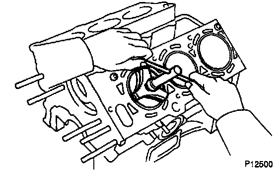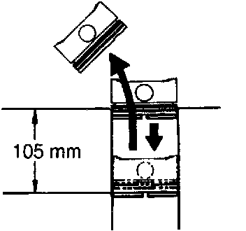 b. Using a piston, push the piston ring a little beyond the bottom of the ring travel, 105 mm (4.13 inch) from the top of the cylinder block.