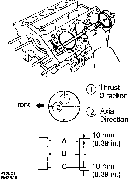 Using a cylinder gauge, measure the cylinder bore diameter at positions A, B and C in the thrust and axial directions.