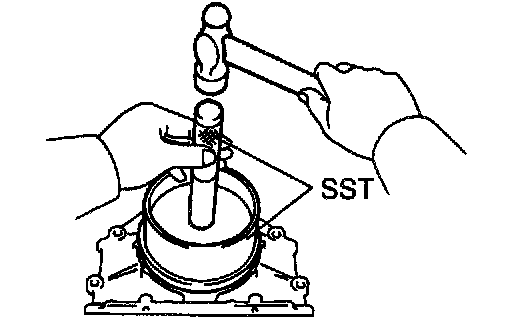 4) Using SST and a hammer, tap in the oil seal until its surface is flush with the rear oil seal retainer edge.