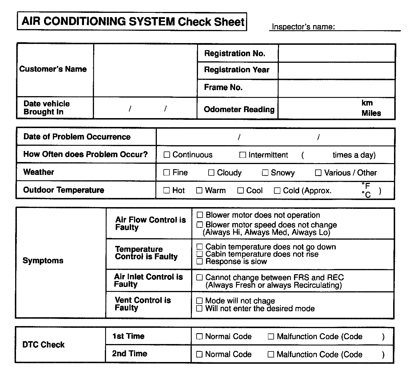 Air Conditioning Check Sheet: