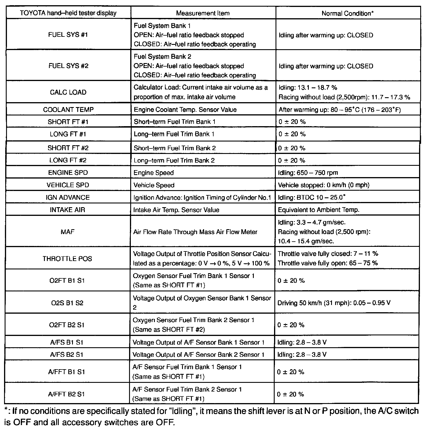 ENGINE OPERATING CONDITIONNOTE: The values given below for "Normal Condition" are representative values, so a vehicle may still be normal even if its value varies differ from those listed here. So do not decide whether a part is faulty or not solely according to the "Normal Condition" here.