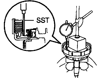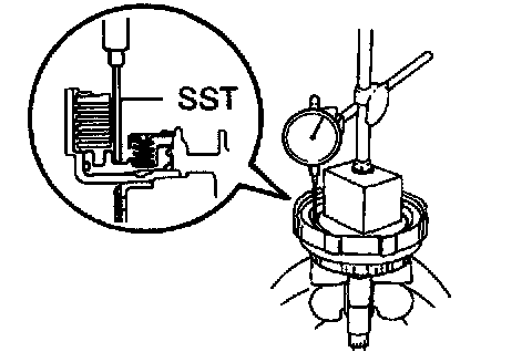 Install a dial indicator and measuring terminal Special Service Tool (SST) together, measure the forward clutch piston stroke while applying and releasing compressed air (392 - 785 kPa, 4 - 8 kgf/cm2, 57 - 114 psi).